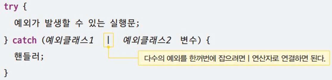 //Exception 객체를 처리하는 catch 블록에서 모든 예외를 처리하므로