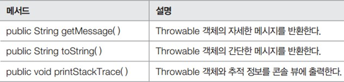 - 예외와 관련된 정보는 Throwable 클래스에 있는 메서드에서 얻을 수 있다.